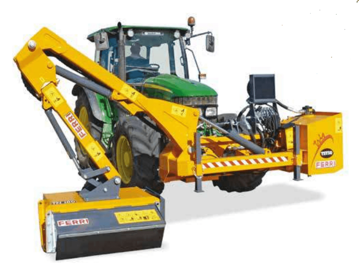 1 - Epareuse frontale hydraulique TST principalement adaptée à l’entretien des bords de routes et des communes. Le second bras est pourvu d’un dispositif de sécurité hydraulique et d’un système anti-basculement automatique. Portée horizontale de 5 m. Commande électrique à double vitesses (DS-Tronic Dual).