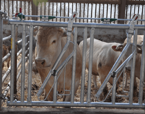 Cornadis adapté aux races à viande faiblement encornées grâce à ses bras mobiles cintrés.