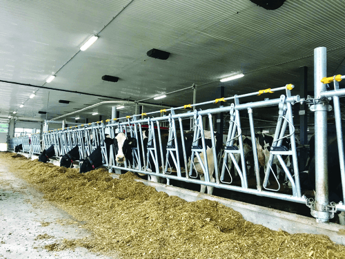 Le cornadis à encolure réglable automatiquement, polyvalent et silencieux s’adapte aux bovins encornés ou écorné (modèle Confort SRS).
