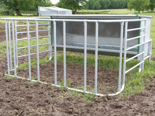 Nourrisseur 2,2 m ou 3 m avec auge anti gaspillage de grande dimension. Livré avec enclos relevable pour l'alimentation des bovins encornés.