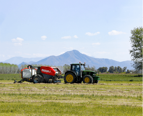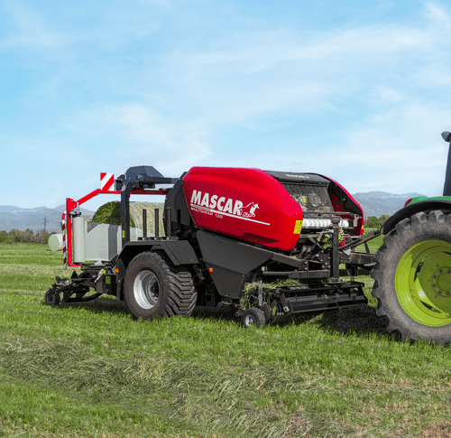 Chambre fixe à 18 rouleaux, balles 1,20 x 1,30 m, pick-up largeur 2,10 m avec roues réglables et rouleau tasse andain, ameneur rotatif en HARDOX® avec nettoyage automatique des couteaux. Liage automatique, pneus 600/55-22.5, système de gestion automatique des phases de pressage et d’enrubannage. Contrôle de la densité de la balle par le boîtier électronique, lubrification automatique des chaînes, cardan grand angle à cames, trappe de débourrage, double satellites avec tendeur de film pour bobines de 750 mm, supports 6 bobines, feux à LED. Autres options possibles.