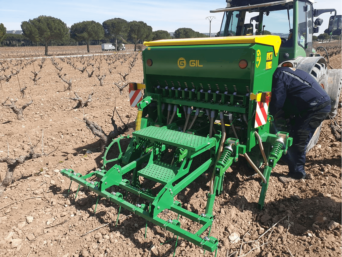 Semoir à vignes mécanique direct à soc en tungstène en T inverse, distributeur à ergot double pour les graines fines et les grosses graines, plateau de pesée, tubes de descente à ressort en métal, herse à dents, variateur de vitesse, contrôle de la profondeur par les roues, passerelle de remplissage, indicateur du niveau de grain, feux de transport. Capacité de la trémie de 130 L à 355 L selon les semoirs. Choix d'équipements pour toutes les utilisations.