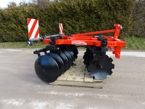 Disques crantés avant et lisses arrière diamètre 610 mm, écartement 230 mm.