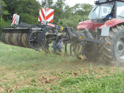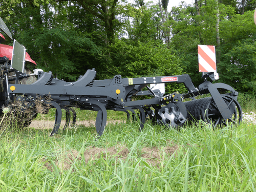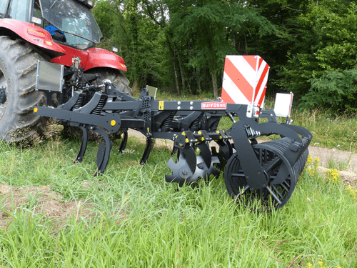 Petit déchaumeur à dents porté BEARCUB châssis tripoutre 100 x 100 mm et 3 rangées de dents type Blackbear avec socs, à sécurité non-stop ressort, hauteur 720 mm et dégagement sous châssis 850 mm. Ecartement entre dents 300 mm et entre barres 700 mm. Rangée de disques niveleurs type FLEAU 450mm montés sur sécurités élastomères 40 mm, réglage mécanique des disques de nivellement et de la profondeur de travail. Rouleau Z de 500 mm de diamètre.