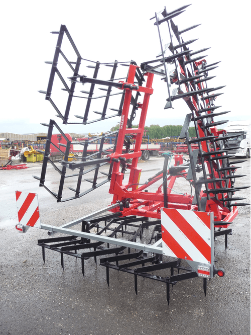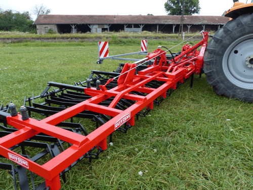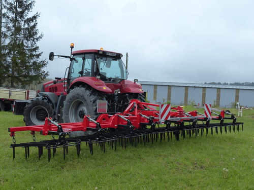 2 - Herse HVSL est un modèle lourd équipé de dents mangano-siliceux de 28 mm, longueur 280 mm qui conviennent aux sols les plus durs. Châssis bipoutre 100 x 100 jusqu’à 6,3 m et tripoutre à partir de 7,3 m.