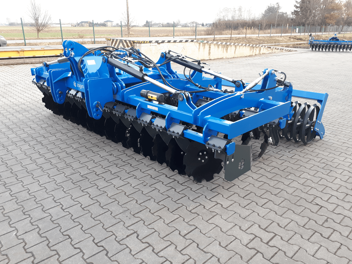 2 rangées de disques diam 560mm, sécurité amortisseurs caoutchouc, déflecteurs latéraux réglables en hauteur, éclairage, terrage hydraulique, rouleau barre diam 600mm.