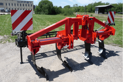 1 dent droite, épaisseur 30 mm, soc sabot en acier traité, dégagement sous châssis 900 mm. Sécurité par boulon de cisaillement. Poids 244 kg. Largeur de travail 1,1 m, 1 dent.