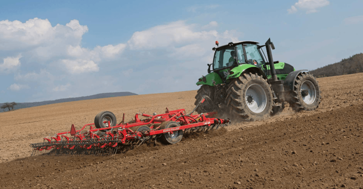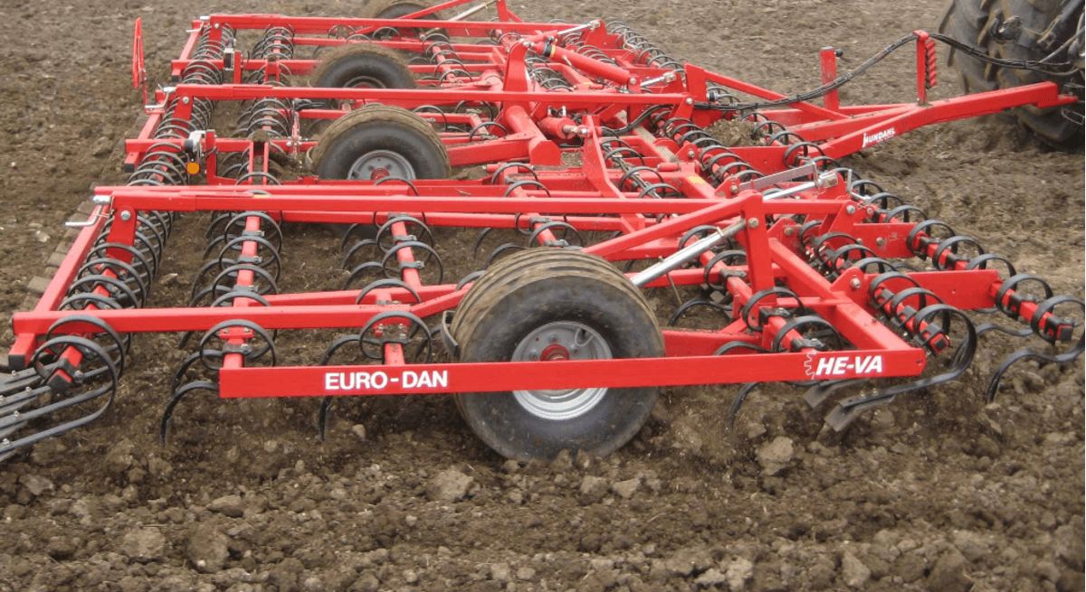 1 - Le vibroculteur Euro-Dan Eco équipé de 4 rangées de dents de herse pour une profondeur contrôlée, réglée et régulière de la herse et un compactage uniforme avec de grandes roues maintenant une profondeur constante sur tous types de sol même difficiles. Disponible de 5 m à 8 m de largeur de travail. Grands choix d’équipements en option pour de nombreuse combinaisons pour différentes tailles d’exploitations. Machine parfaite pout lit de semence pour les betteraves, le maïs et les céréales, etc.