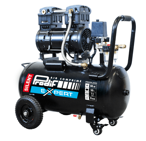 Sans huile. 6 L. Débit restitué : 61 L/min, 8 Bar. Moteur bicylindre S1, 0,75 CV. 220 V.