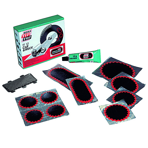 Rustines bordées d'une double dentelure permettant une liaison parfaite avec la chambre à air et une vulcanisation à 100%. Contient : 4 rustines n°1 (ronde, Ø 33 mm), 2 rustines n°2 (ronde, Ø 45 mm), 1 rustine n°3 (ronde, Ø 54 mm), 1 rustine n°4 (ronde, Ø 75 mm), 1 rustine n°7 (ovale, 74x37 mm), 1 rustine F3, 1 tube de 10 g de liquide vulcanisant, 1 râpe métal.