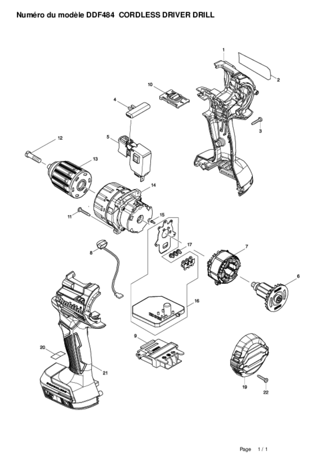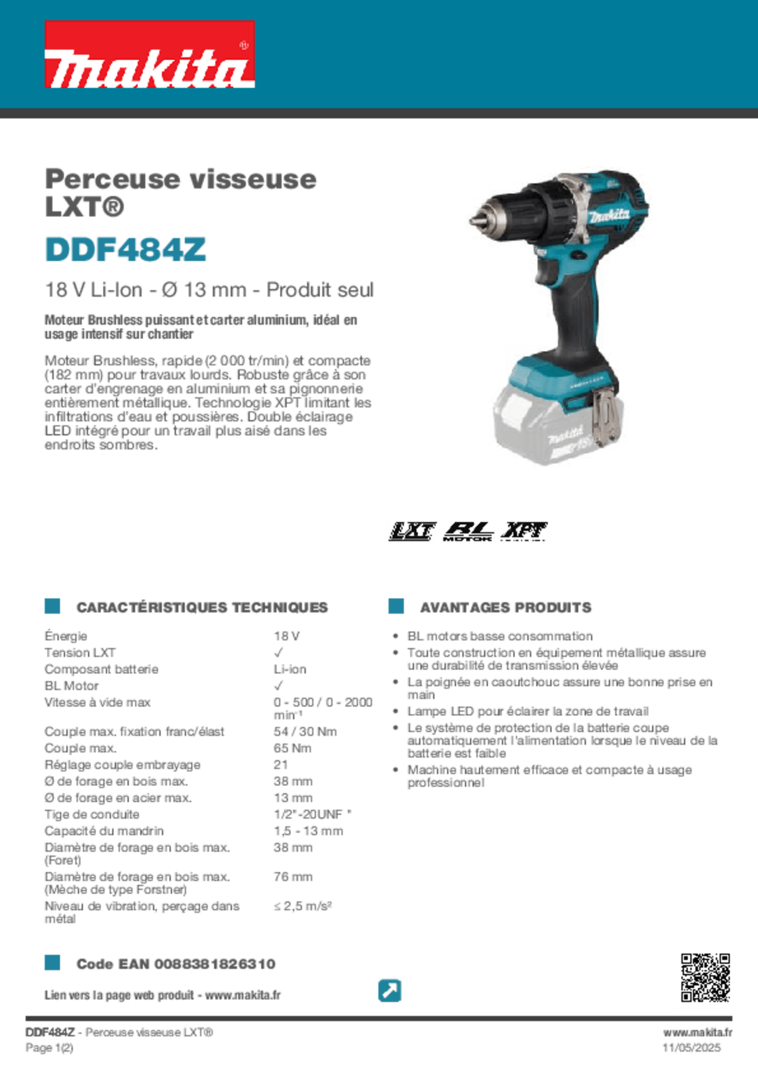 Perceuse-visseuse DDF484Z. Régime à vide : 0 à 500 tr/min, 0 à 2000 tr/min. Couple de serrage maxi (élast.) : 30 Nm. Couple de serrage maxi (franc) : 54 Nm. Couple réglable sur 21 positions + position perçage. Capacité : acier : 13 mm, bois : 38 mm. Mandrin autoserrant : 13 mm. Niveau de vibration, perçage dans métal < 2,5 m/s². Poignée à revêtement Soft Grip pour plus de confort. Livrée avec : - crochet ceinture. Vendue sans batterie.