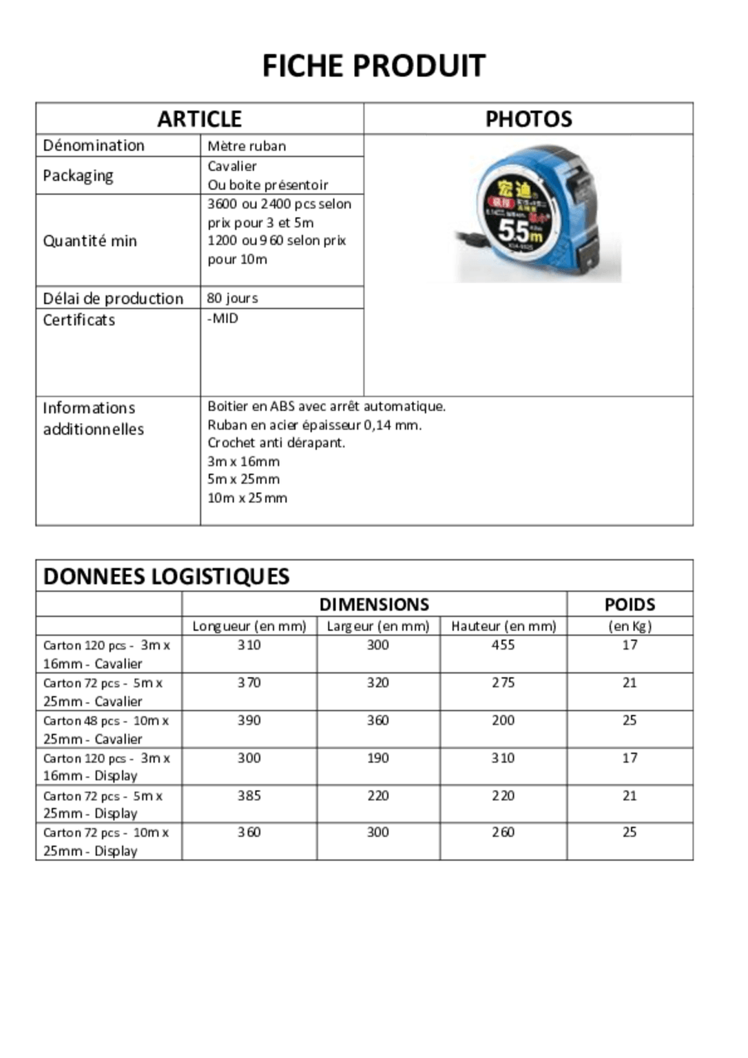 Mètre ruban 25 mm. Longueur : 10 mètres. Boitier compact. Arrêt automatique, crochet antidérapant.