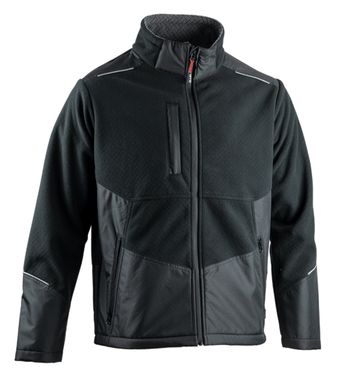 Col montant, empiècements en oxford 300D imperméable sur les épaules, fermé par zip avec patte protège menton, 1 poche poitrine zippée sous patte, 2 grandes poches basses zippées avec renforts en oxford, 2 poches basses intérieures, bas de manches renforcés en oxford, dos rallongé.