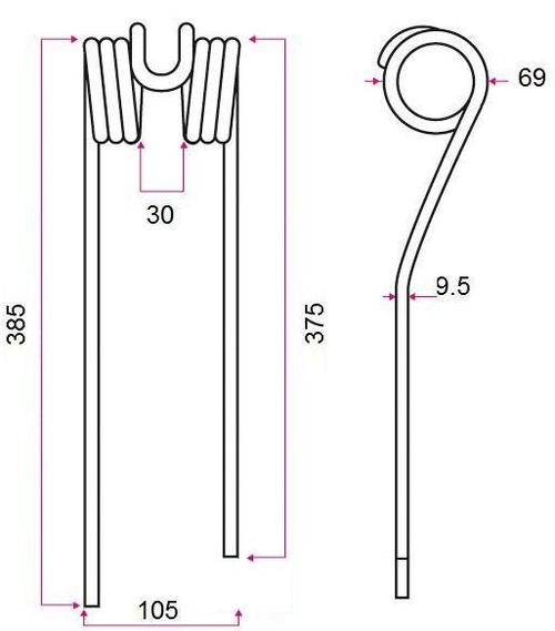 Dent de faneuse Adaptable. Longueur 1 : 385 mm. Longueur 2 : 375 mm. Largeur : 105 mm. Épaisseur : 9,5...