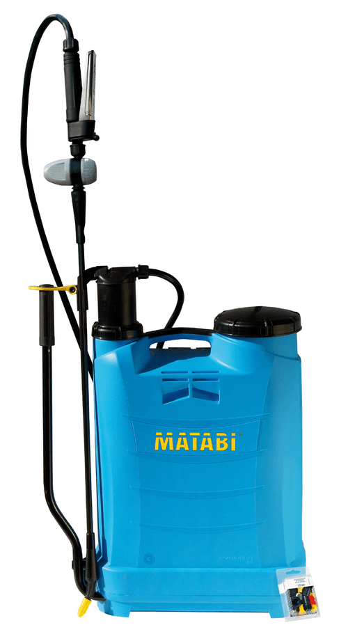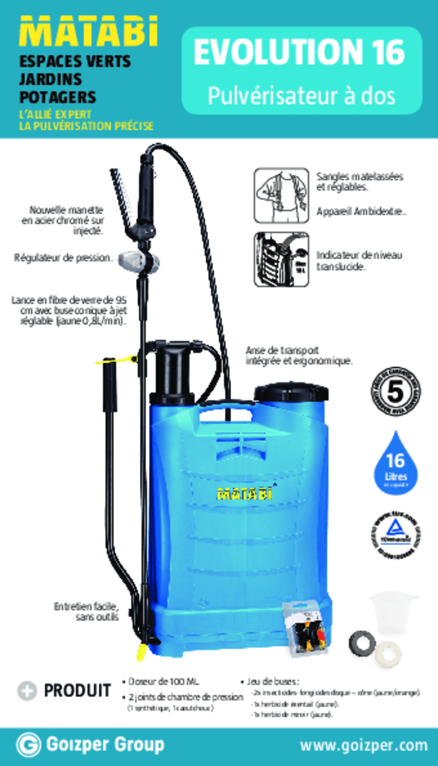 Avec 2 buses insecticides / fongicides disque cône, 1 buse herbicides éventail, 1 buse herbicide miroir, 1 doseur de 100 ml, 2 joints de chambre de pression (1 synthétique, 1 caoutchouc).