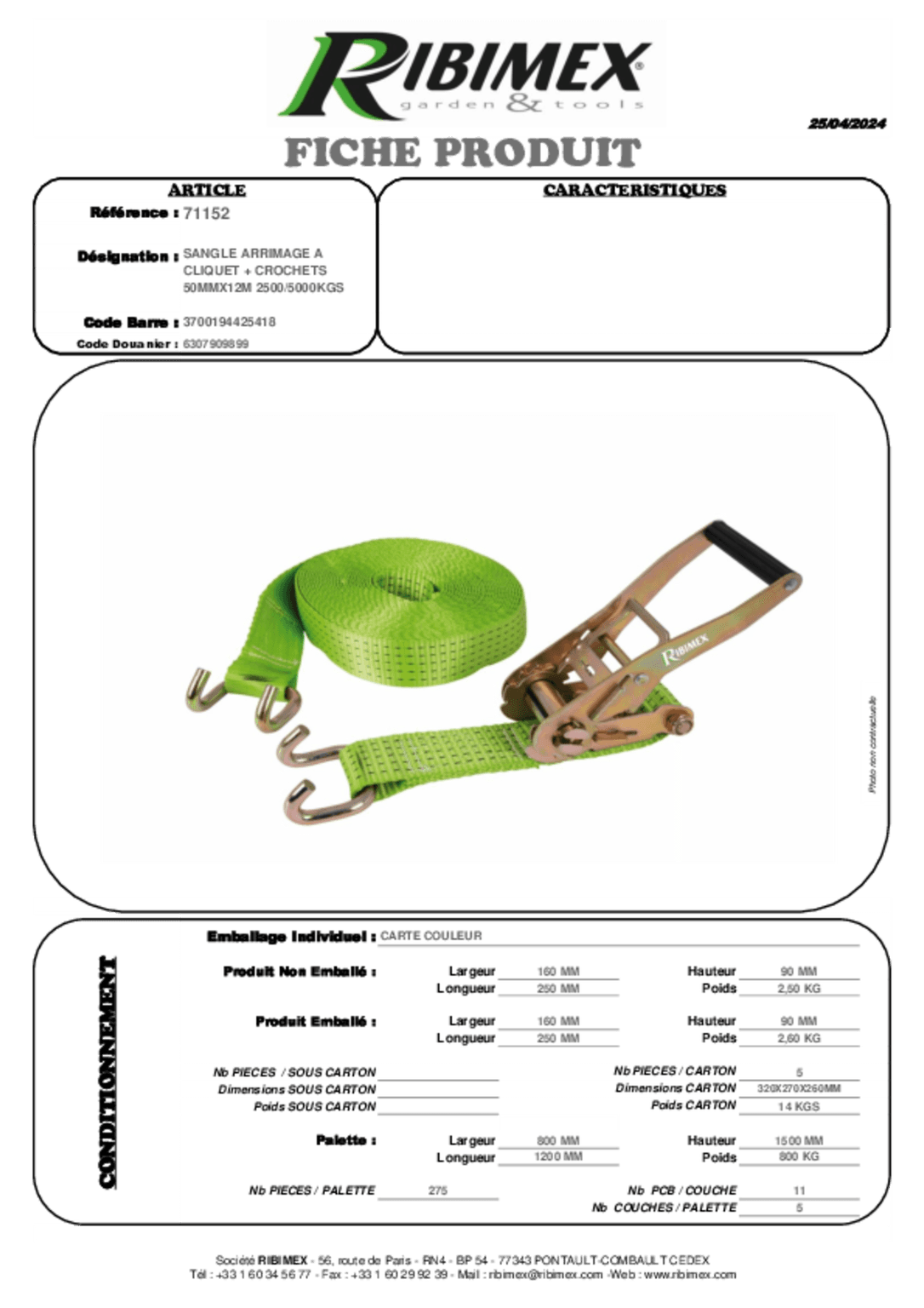 Longueur : 4 m. Charge maximale de travail : 2 tonnes. Couleur : vert.